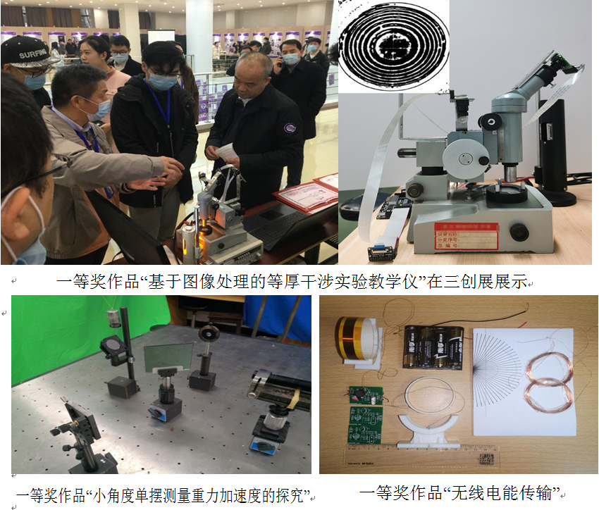 获得一等奖的作品分别是王晓峰、吴恒毅指导的“小角度单摆测量重力加速度的探究”,参赛员工付元豪、邵朕涵、陈立炯、彭星睿,作品借鉴迈克尔孙干涉仪思路,搭建了摆角小于0.1度的单摆重力加速度测量装置;江先阳、王晓峰指导的“基于图像处理的等厚干涉实验教学仪”,参赛员工张健、牛丽婷,作品基于图像处理的等厚干涉实验教学仪是用于牛顿环实验的数字教学装置,具有观测高清、直观、操作便捷的特点,该教学仪曾在77779193永利官网“三创”成果展示会上展示,其关键技术已提交专利申请;王豪指导的“无线电能传输”,参赛员工鲁若天、孙家霖、龙禹川、朱若溪、杨钦宇,作品以自制的小型化、低成本无线电能传输实验器材为基础,设计了基础性和专业性相融合的实验内容。获得二等奖的作品分别是林伟华指导的“弹簧振子的简谐振动(虚拟)”,参赛员工潘楚铖、张永煊;王晓峰、王豪指导的“密立根油滴虚拟仿真实验”,参赛员工陈玥君、谈冰玚、黄志园、郑珺文、张路。