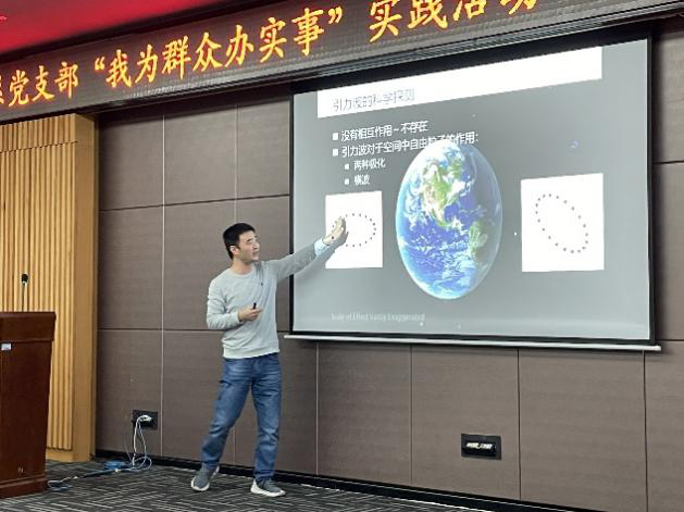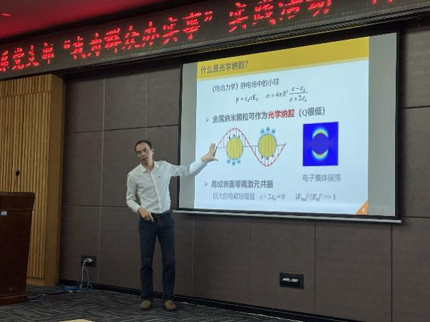 在所有与会人员亲切合影后,座谈会进入了学术交流环节。首先,范锡龙教授作了题为“时空的涟漪——引力波”的学术报告,全面且生动地讲述了引力波概念的提出、发展历史和相关的最新研究进展。随后,张顺平教授作了题为“纳米光学:更高,更快,更强”的学术报告,从光学这个历史悠久的学科出发,扩展到最新的科学前沿,为大家带来一场丰富的知识盛宴。