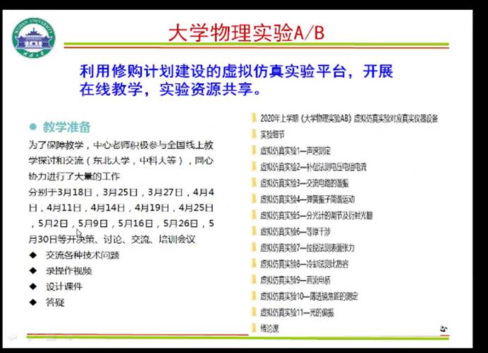 会议邀请了大学物理教学中心沈黄晋和实验中心主任吴奕初两位老师,由他们介绍本学期在线开展大学物理理论和实验教学实施情况与经验。